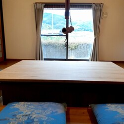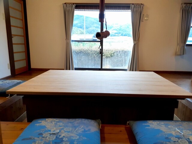 囲炉裏の天板が壊れたので、大工さんにお願いして一回り大きい天板を作って頂きました。昔の囲炉裏はもう完全に使えませんが、ゆったりと囲炉裏の間で歓談を楽しんでください。14人程度は座れますし、床暖房があって温かいですよ!